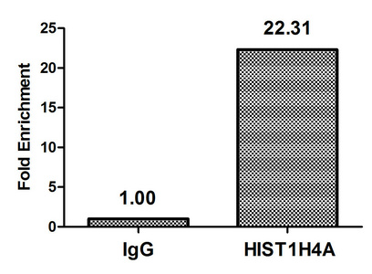 Chromatin Immunoprecipitation Hela (4*106) were treated with Micrococcal Nuclease, sonicated, and immunoprecipitated with 5µg anti-HIST1H4A (CSB-PA010429OA31nsucHU) or a control normal rabbit IgG. The resulting ChIP DNA was quantified using real-time PCR with primers against the β-Globin promoter.