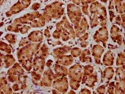 IHC image of CSB-PA010429OA31nsucHU diluted at 1:20 and staining in paraffin-embedded human pancreatic cancer performed on a Leica BondTM system. After dewaxing and hydration, antigen retrieval was mediated by high pressure in a citrate buffer (pH 6.0). Section was blocked with 10% normal goat serum 30min at RT. Then primary antibody (1% BSA) was incubated at 4°C overnight. The primary is detected by a biotinylated secondary antibody and visualized using an HRP conjugated SP system.
