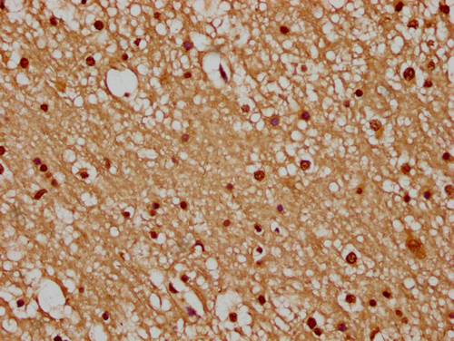 IHC image of CSB-PA010429PA35nme1HU diluted at 1:50 and staining in paraffin-embedded human brain tissue performed on a Leica BondTM system. After dewaxing and hydration, antigen retrieval was mediated by high pressure in a citrate buffer (pH 6.0). Section was blocked with 10% normal goat serum 30min at RT. Then primary antibody (1% BSA) was incubated at 4°C overnight. The primary is detected by a biotinylated secondary antibody and visualized using an HRP conjugated SP system.