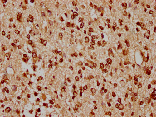 IHC image of CSB-PA010429PA91nacHU diluted at 1:20 and staining in paraffin-embedded human glioma cancer performed on a Leica BondTM system. After dewaxing and hydration, antigen retrieval was mediated by high pressure in a citrate buffer (pH 6.0). Section was blocked with 10% normal goat serum 30min at RT. Then primary antibody (1% BSA) was incubated at 4°C overnight. The primary is detected by a biotinylated secondary antibody and visualized using an HRP conjugated SP system.