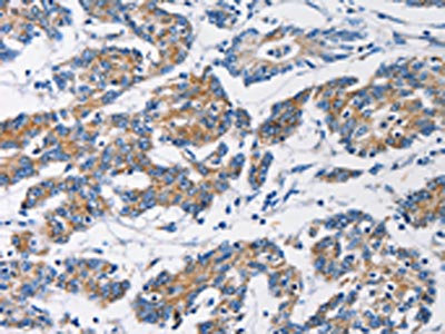 The image on the left is immunohistochemistry of paraffin-embedded Human colon cancer tissue using CSB-PA093794(HK1 Antibody) at dilution 1/50, on the right is treated with fusion protein. (Original magnification: ×200)