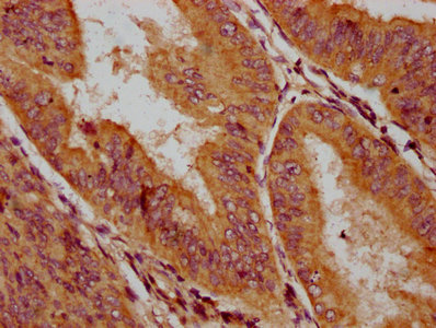 IHC image of CSB-PA010518LA01HU diluted at 1:200 and staining in paraffin-embedded human endometrial cancer performed on a Leica BondTM system. After dewaxing and hydration, antigen retrieval was mediated by high pressure in a citrate buffer (pH 6.0). Section was blocked with 10% normal goat serum 30min at RT. Then primary antibody (1% BSA) was incubated at 4°C overnight. The primary is detected by a biotinylated secondary antibody and visualized using an HRP conjugated SP system.