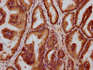IHC image of CSB-PA010518LA01HU diluted at 1:200 and staining in paraffin-embedded human prostate tissue performed on a Leica BondTM system. After dewaxing and hydration, antigen retrieval was mediated by high pressure in a citrate buffer (pH 6.0). Section was blocked with 10% normal goat serum 30min at RT. Then primary antibody (1% BSA) was incubated at 4°C overnight. The primary is detected by a biotinylated secondary antibody and visualized using an HRP conjugated SP system.