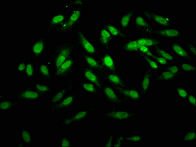 Immunofluorescence staining of Hela cells with CSB-PA010664LA01HU at 1:166, counter-stained with DAPI. The cells were fixed in 4% formaldehyde, permeabilized using 0.2% Triton X-100 and blocked in 10% normal Goat Serum. The cells were then incubated with the antibody overnight at 4°C. The secondary antibody was Alexa Fluor 488-congugated AffiniPure Goat Anti-Rabbit IgG(H+L).