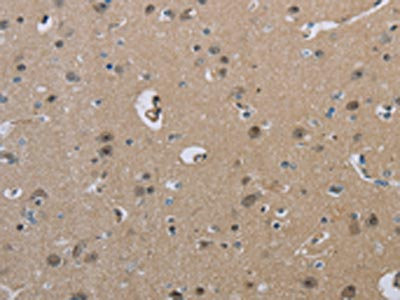 The image on the left is immunohistochemistry of paraffin-embedded Human brain tissue using CSB-PA153980(HSD3B1 Antibody) at dilution 1/40, on the right is treated with fusion protein. (Original magnification: ×200)
