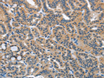 The image on the left is immunohistochemistry of paraffin-embedded Human thyroid cancer tissue using CSB-PA153980(HSD3B1 Antibody) at dilution 1/40, on the right is treated with fusion protein. (Original magnification: ×200)