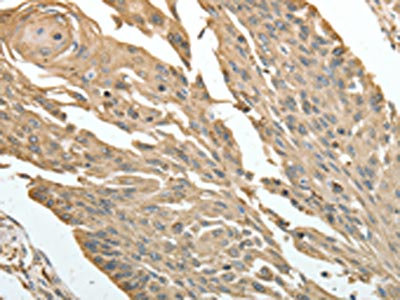 The image on the left is immunohistochemistry of paraffin-embedded Human cervical cancer tissue using CSB-PA179036(HSP90B1 Antibody) at dilution 1/30, on the right is treated with fusion protein. (Original magnification: ×200)