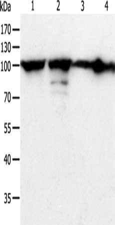 Gel: 10%SDS-PAGE, Lysate: 40 μg, Lane 1-4: Hela cells, human liver cancer tissue, Jurkat cells, NIH/3T3 cells, Primary antibody: CSB-PA088395(HSP90B1 Antibody) at dilution 1/900, Secondary antibody: Goat anti rabbit IgG at 1/8000 dilution, Exposure time: 3 seconds