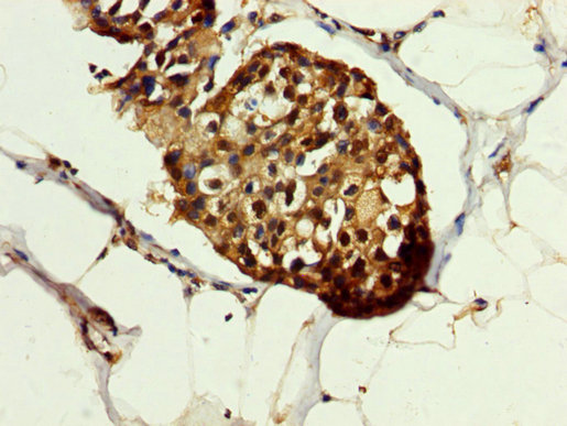 IHC image of CSB-PA10899A0Rb diluted at 1:200 and staining in paraffin-embedded human breast cancer performed on a Leica BondTM system. After dewaxing and hydration, antigen retrieval was mediated by high pressure in a citrate buffer (pH 6.0). Section was blocked with 10% normal goat serum 30min at RT. Then primary antibody (1% BSA) was incubated at 4°C overnight. The primary is detected by a biotinylated secondary antibody and visualized using an HRP conjugated SP system.