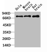 Western blot analysis of 1) Hela Cell Lysate, 2)Mouse Brain Tissue Lysate, 3) Rat Brain Tissue Lysate using HSC70 Rabbit pAb diluted at 1:2000.