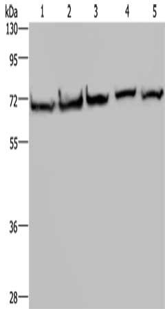 Gel: 8%SDS-PAGE, Lysate: 40 μg, Lane 1-5: HT29 cells, A549 cells, 293T cells, MCF7 cells, Hela cells, Primary antibody: CSB-PA933674(HSPA9 Antibody) at dilution 1/300, Secondary antibody: Goat anti rabbit IgG at 1/8000 dilution, Exposure time: 10 seconds