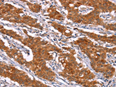 The image on the left is immunohistochemistry of paraffin-embedded Human gastric cancer tissue using CSB-PA780646(HSPB6 Antibody) at dilution 1/40, on the right is treated with synthetic peptide. (Original magnification: ×200)