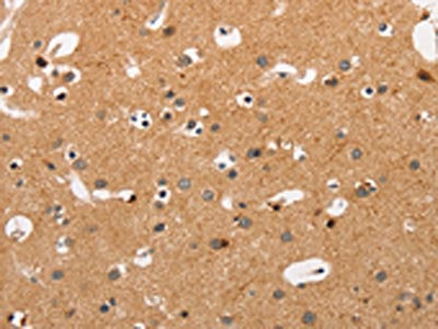 The image on the left is immunohistochemistry of paraffin-embedded Human brain tissue using CSB-PA141533(HSPB8 Antibody) at dilution 1/45, on the right is treated with fusion protein. (Original magnification: ×200)