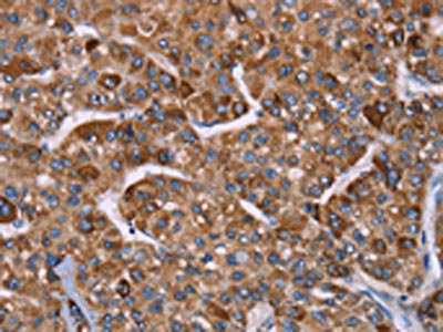 The image on the left is immunohistochemistry of paraffin-embedded Human liver cancer tissue using CSB-PA557724(HSPE1 Antibody) at dilution 1/40, on the right is treated with synthetic peptide. (Original magnification: ×200)