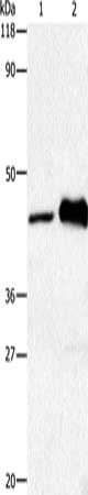 Gel: 8%SDS-PAGE, Lysate: 30 μg, Lane 1-2: HT29 cells, Mouse brain tissue, Primary antibody: CSB-PA109594(HTR1A Antibody) at dilution 1/1500, Secondary antibody: Goat anti rabbit IgG at 1/8000 dilution, Exposure time: 2 minutes