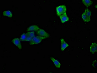 Immunofluorescence staining of HepG2 cells with CSB-PA835695LA01HU at 1:166, counter-stained with DAPI. The cells were fixed in 4% formaldehyde, permeabilized using 0.2% Triton X-100 and blocked in 10% normal Goat Serum. The cells were then incubated with the antibody overnight at 4°C. The secondary antibody was Alexa Fluor 488-congugated AffiniPure Goat Anti-Rabbit IgG(H+L).