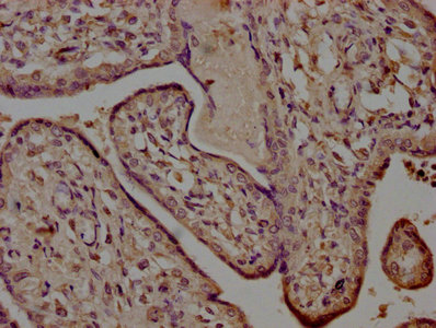 IHC image of CSB-PA835695LA01HU diluted at 1:500 and staining in paraffin-embedded human placenta tissue performed on a Leica BondTM system. After dewaxing and hydration, antigen retrieval was mediated by high pressure in a citrate buffer (pH 6.0). Section was blocked with 10% normal goat serum 30min at RT. Then primary antibody (1% BSA) was incubated at 4°C overnight. The primary is detected by a biotinylated secondary antibody and visualized using an HRP conjugated SP system.