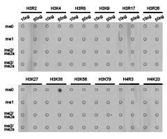 免疫原:A synthetic methylated peptide corresponding to residues surrounding K36 of Human histone H3