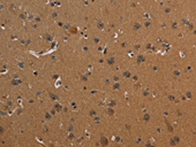 The image on the left is immunohistochemistry of paraffin-embedded Human brain tissue using CSB-PA440434(ICAM4 Antibody) at dilution 1/30, on the right is treated with fusion protein. (Original magnification: ×200)