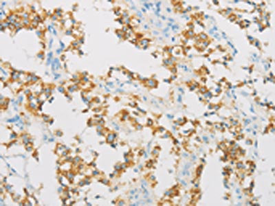 The image on the left is immunohistochemistry of paraffin-embedded Human thyroid cancer tissue using CSB-PA597290(IDH3B Antibody) at dilution 1/30, on the right is treated with fusion protein. (Original magnification: ×200)