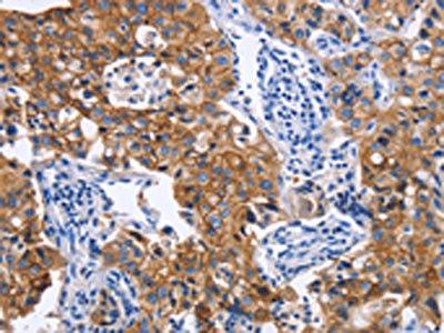 The image on the left is immunohistochemistry of paraffin-embedded Human lung cancer tissue using CSB-PA995781(IFNG Antibody) at dilution 1/30, on the right is treated with fusion protein. (Original magnification: ×200)
