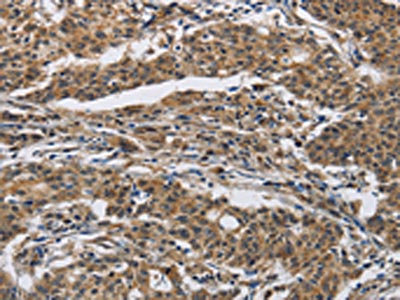 The image on the left is immunohistochemistry of paraffin-embedded Human liver cancer tissue using CSB-PA149561(IFNGR2 Antibody) at dilution 1/40, on the right is treated with synthetic peptide. (Original magnification: ×200)