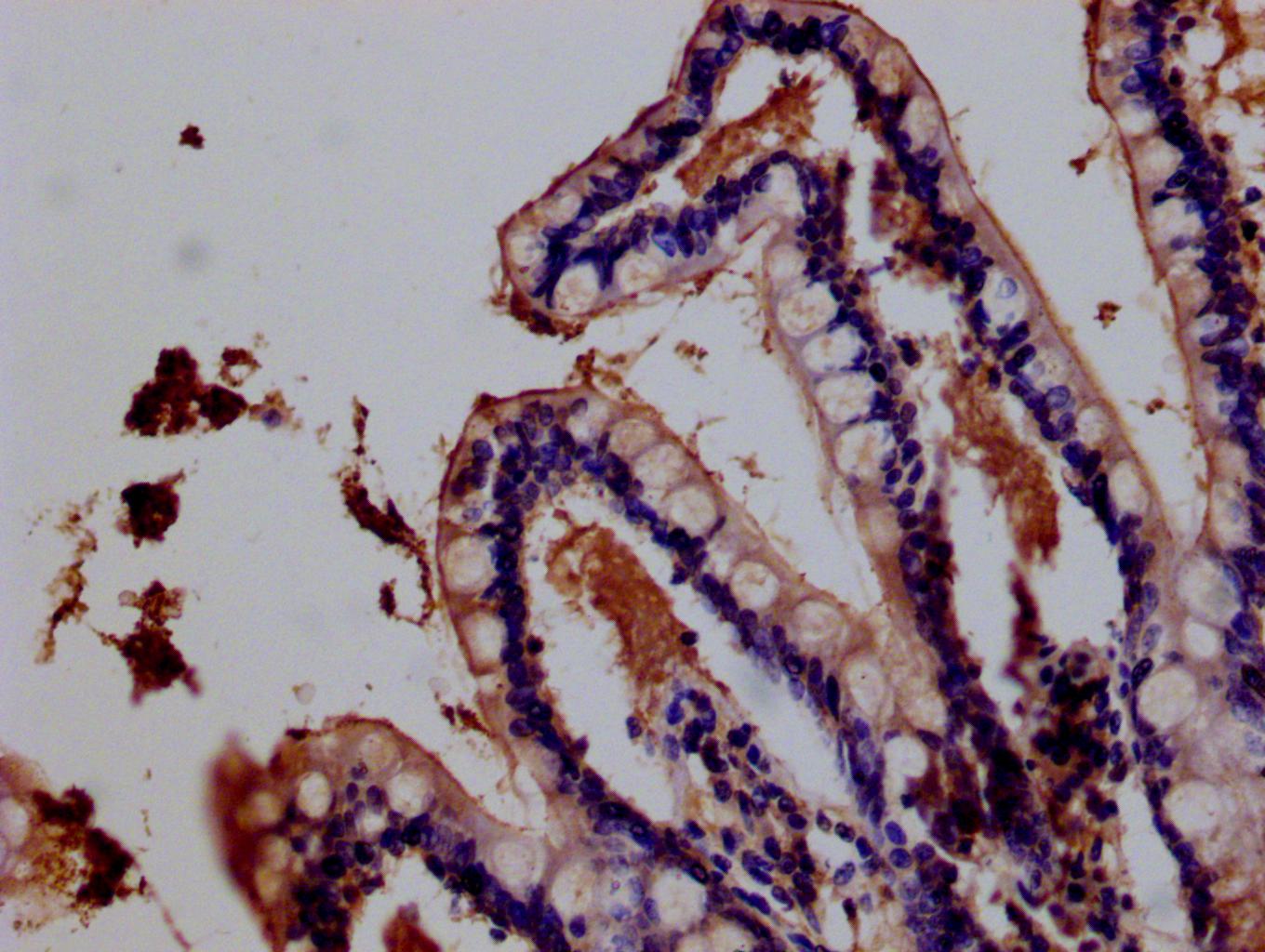 IHC image of CSB-PA816871ESR1HU diluted at 1:200 and staining in paraffin-embedded human small intestine tissue performed on a Leica BondTM system. After dewaxing and hydration, antigen retrieval was mediated by high pressure in a citrate buffer (pH 6.0). Section was blocked with 10% normal goat serum 30min at RT. Then primary antibody (1% BSA) was incubated at 4°C overnight. The primary is detected by a Goat anti-rabbit polymer IgG labeled by HRP and visualized using 0.05% DAB.