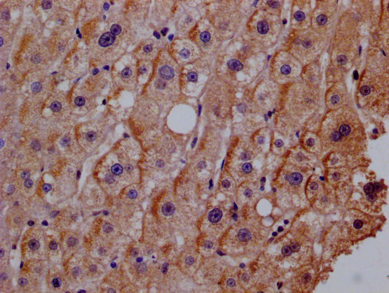 IHC image of CSB-PA816871ESR1HU diluted at 1:200 and staining in paraffin-embedded human liver cancer performed on a Leica BondTM system. After dewaxing and hydration, antigen retrieval was mediated by high pressure in a citrate buffer (pH 6.0). Section was blocked with 10% normal goat serum 30min at RT. Then primary antibody (1% BSA) was incubated at 4°C overnight. The primary is detected by a Goat anti-rabbit polymer IgG labeled by HRP and visualized using 0.05% DAB.