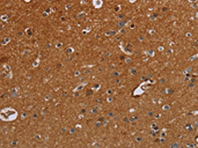 The image on the left is immunohistochemistry of paraffin-embedded Human brain tissue using CSB-PA286863(IFRD1 Antibody) at dilution 1/30, on the right is treated with fusion protein. (Original magnification: ×200)