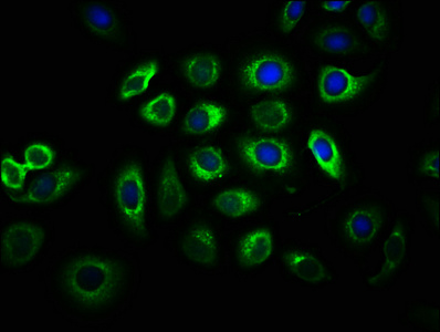 Immunofluorescence staining of A549 cells with CSB-PA011093LA01HU at 1:33, counter-stained with DAPI. The cells were fixed in 4% formaldehyde, permeabilized using 0.2% Triton X-100 and blocked in 10% normal Goat Serum. The cells were then incubated with the antibody overnight at 4°C. The secondary antibody was Alexa Fluor 488-congugated AffiniPure Goat Anti-Rabbit IgG(H+L).