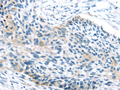 The image on the left is immunohistochemistry of paraffin-embedded Human esophagus cancer tissue using CSB-PA153577(IGFBP3 Antibody) at dilution 1/45, on the right is treated with synthetic peptide. (Original magnification: ×200)