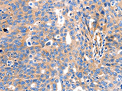 The image on the left is immunohistochemistry of paraffin-embedded Human ovarian cancer tissue using CSB-PA082992(IGFBP7 Antibody) at dilution 1/50, on the right is treated with synthetic peptide. (Original magnification: ×200)