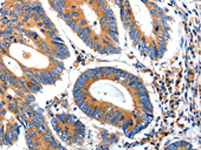 The image on the left is immunohistochemistry of paraffin-embedded Human colon cancer tissue using CSB-PA082992(IGFBP7 Antibody) at dilution 1/50, on the right is treated with synthetic peptide. (Original magnification: ×200)