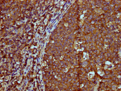 IHC image of CSB-PA360788LA01HU diluted at 1:600 and staining in paraffin-embedded human tonsil tissue performed on a Leica BondTM system. After dewaxing and hydration, antigen retrieval was mediated by high pressure in a citrate buffer (pH 6.0). Section was blocked with 10% normal goat serum 30min at RT. Then primary antibody (1% BSA) was incubated at 4°C overnight. The primary is detected by a biotinylated secondary antibody and visualized using an HRP conjugated SP system.