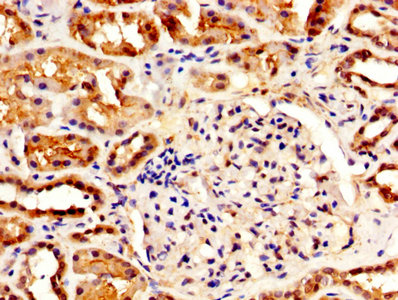 IHC image of CSB-PA622779LA01HU diluted at 1:500 and staining in paraffin-embedded human kidney tissue performed on a Leica BondTM system. After dewaxing and hydration, antigen retrieval was mediated by high pressure in a citrate buffer (pH 6.0). Section was blocked with 10% normal goat serum 30min at RT. Then primary antibody (1% BSA) was incubated at 4°C overnight. The primary is detected by a biotinylated secondary antibody and visualized using an HRP conjugated SP system.