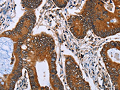The image on the left is immunohistochemistry of paraffin-embedded Human colon cancer tissue using CSB-PA226317(IHH Antibody) at dilution 1/30, on the right is treated with fusion protein. (Original magnification: ×200)