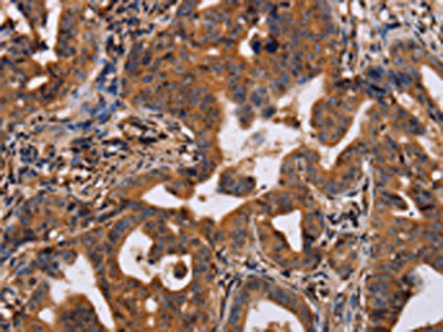 The image on the left is immunohistochemistry of paraffin-embedded Human gastic cancer tissue using CSB-PA944056(IL12RB2 Antibody) at dilution 1/40, on the right is treated with synthetic peptide. (Original magnification: ×200)