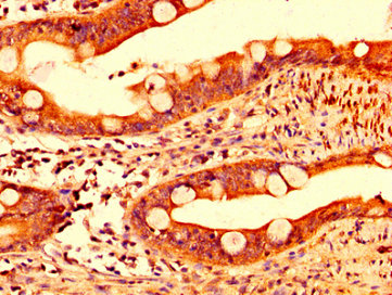 IHC image of CSB-PA842733LA01HU diluted at 1:500 and staining in paraffin-embedded human small intestine tissue performed on a Leica BondTM system. After dewaxing and hydration, antigen retrieval was mediated by high pressure in a citrate buffer (pH 6.0). Section was blocked with 10% normal goat serum 30min at RT. Then primary antibody (1% BSA) was incubated at 4°C overnight. The primary is detected by a biotinylated secondary antibody and visualized using an HRP conjugated SP system.