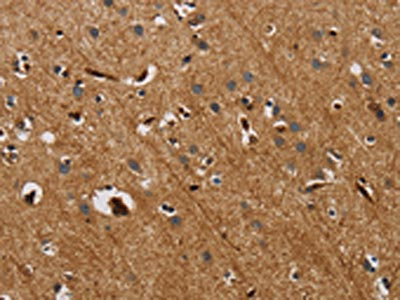 The image is immunohistochemistry of paraffin-embedded Human brain tissue using CSB-PA140943(IL18R1 Antibody) at dilution 1/40. (Original magnification: ×200)
