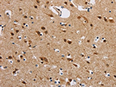 The image on the left is immunohistochemistry of paraffin-embedded Human brain tissue using CSB-PA021391(IL19 Antibody) at dilution 1/40, on the right is treated with synthetic peptide. (Original magnification: ×200)