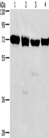 Gel: 10%SDS-PAGE, Lysate: 40 μg, Lane 1-4: 231 cells, 293T cells, Raji cells, hela cells, Primary antibody: CSB-PA061951(IL2RB Antibody) at dilution 1/325, Secondary antibody: Goat anti rabbit IgG at 1/8000 dilution, Exposure time: 20 seconds