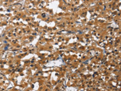 The image on the left is immunohistochemistry of paraffin-embedded Human thyroid cancer tissue using CSB-PA114100(IL2RB Antibody) at dilution 1/60, on the right is treated with fusion protein. (Original magnification: ×200)