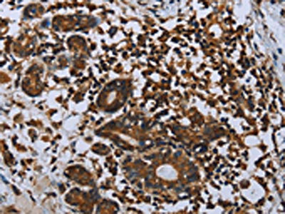 The image on the left is immunohistochemistry of paraffin-embedded Human breast cancer tissue using CSB-PA107902(IL31RA Antibody) at dilution 1/20, on the right is treated with fusion protein. (Original magnification: ×200)