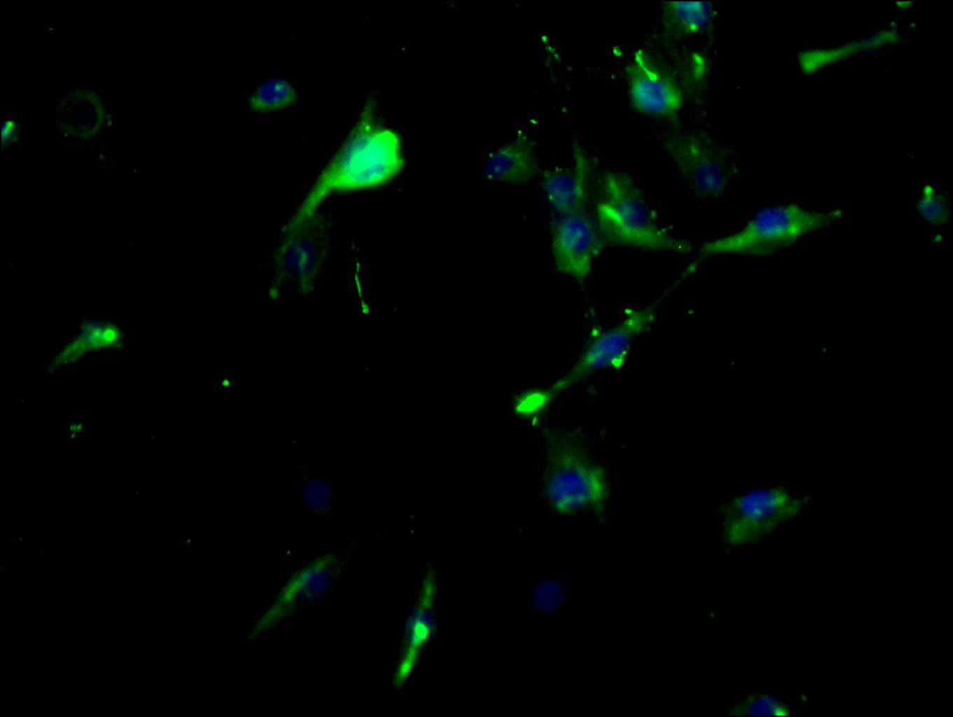 Immunofluorescence staining of U87 cells with CSB-PA011670EA01HU at 1:200, counter-stained with DAPI. The cells were fixed in 4% formaldehyde, permeabilized using 0.2% Triton X-100 and blocked in 10% normal Goat Serum. The cells were then incubated with the antibody overnight at 4°C. The secondary antibody was Alexa Fluor 488-congugated AffiniPure Goat Anti-Rabbit IgG(H+L).