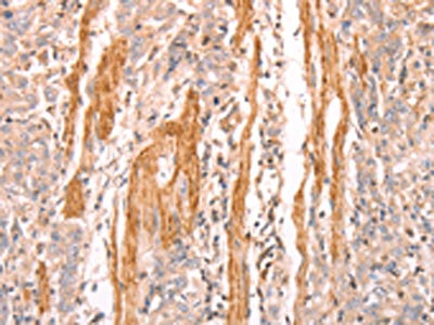 The image on the left is immunohistochemistry of paraffin-embedded Human gastic cancer tissue using CSB-PA102299(INA Antibody) at dilution 1/25, on the right is treated with synthetic peptide. (Original magnification: ×200)