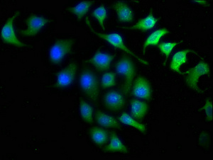 Immunofluorescence staining of A549 cells with CSB-PA011723LA01HU at 1:150, counter-stained with DAPI. The cells were fixed in 4% formaldehyde, permeabilized using 0.2% Triton X-100 and blocked in 10% normal Goat Serum. The cells were then incubated with the antibody overnight at 4°C. The secondary antibody was Alexa Fluor 488-congugated AffiniPure Goat Anti-Rabbit IgG(H+L).