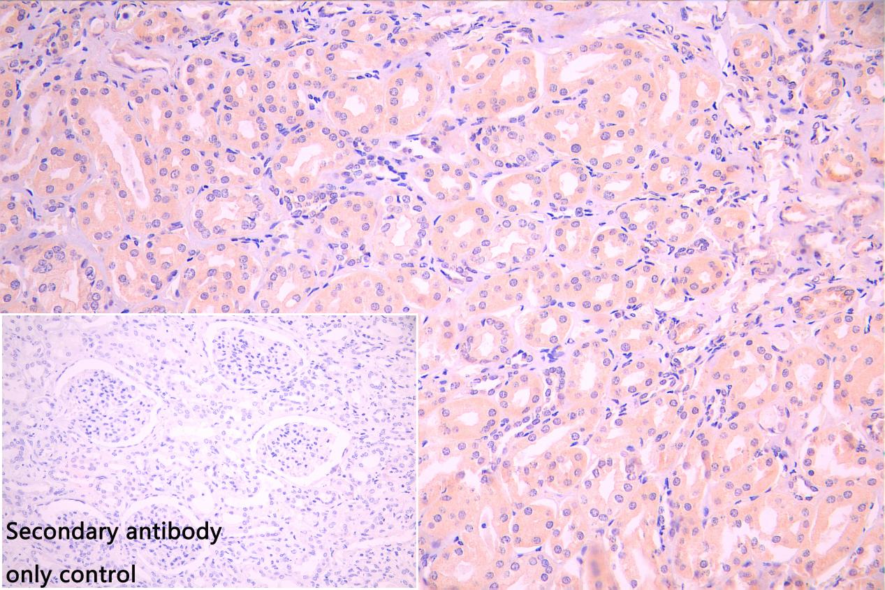 IHC image of CSB-PA011758ESR1HU diluted at 1:100 and staining in paraffin-embedded human kidney tissue performed on a Leica BondTM system. After dewaxing and hydration, antigen retrieval was mediated by high pressure in a citrate buffer (pH 6.0). Section was blocked with 10% normal goat serum 30min at RT. Then primary antibody (1% BSA) was incubated at 4°C overnight. The primary is detected by a Goat anti-rabbit polymer IgG labeled by HRP and visualized using 0.05% DAB. Secondary antibody only control: uses 1% BSA instead of primary antibody