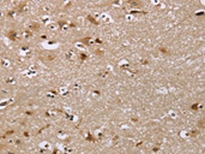 The image on the left is immunohistochemistry of paraffin-embedded Human brain tissue using CSB-PA282529(IQCJ Antibody) at dilution 1/35, on the right is treated with synthetic peptide. (Original magnification: ×200)
