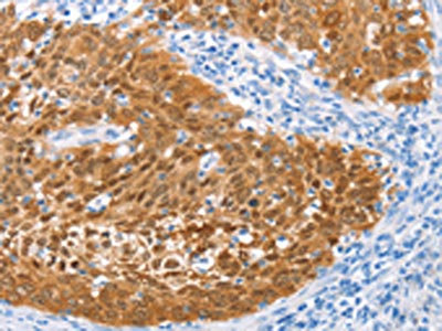 The image on the left is immunohistochemistry of paraffin-embedded Human cervical cancer tissue using CSB-PA287048(IRF6 Antibody) at dilution 1/50, on the right is treated with fusion protein. (Original magnification: ×200)