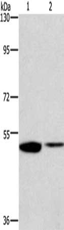 Gel: 8%SDS-PAGE, Lysate: 40 μg, Lane 1-2: Mouse kidney tissue, Mouse lung tissue, Primary antibody: CSB-PA287048(IRF6 Antibody) at dilution 1/200, Secondary antibody: Goat anti rabbit IgG at 1/8000 dilution, Exposure time: 2 minutes